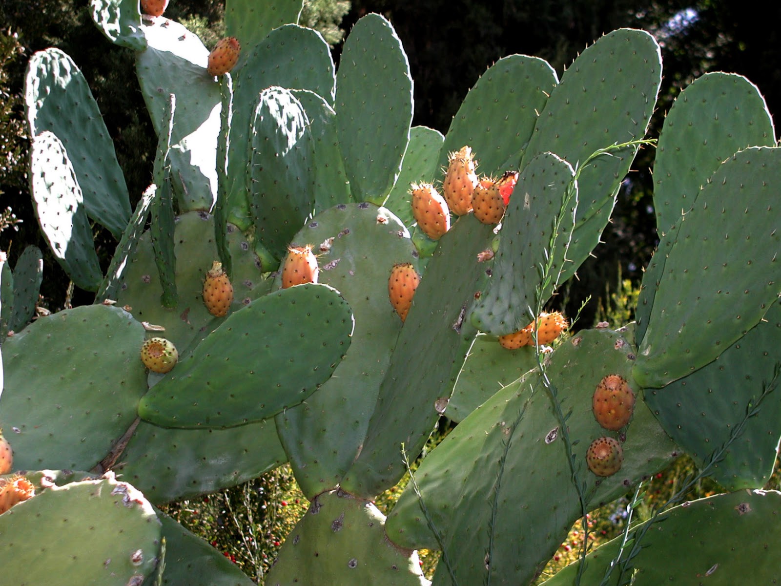 Opuntia ficus-indica is a species of cactus that has long been a domesticated crop plant important in agricultural economies throughout arid and semiarid parts of the world. It is thought to possibly be native to Mexico. Some of the common English names for the plant and its fruit are Indian fig, opuntia, barbary fig, cactus pear, spineless cactus, and prickly pear, although this last name has also been applied to other less common Opuntia species. In Mexican Spanish the plant is called nopal, while the fruit is called tuna, which are names also used in American English, especially as culinary terms.